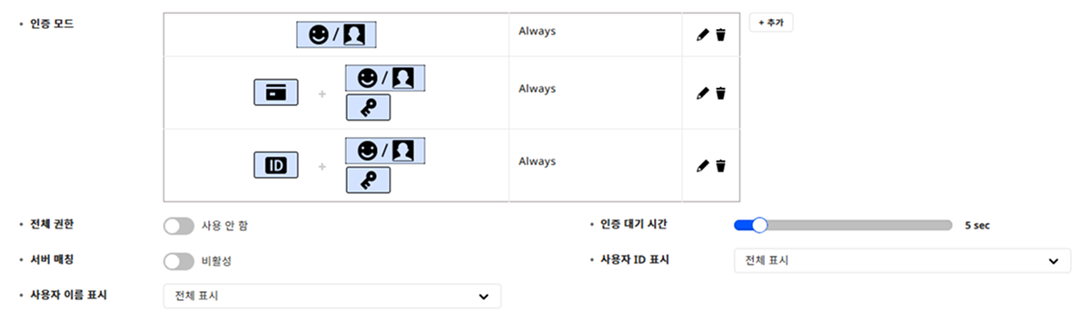 비활성: 서버 매칭 기능을 비활성화합니다. 이 경우 장치에 등록된 사용자 정보로 인증을 수행합니다.