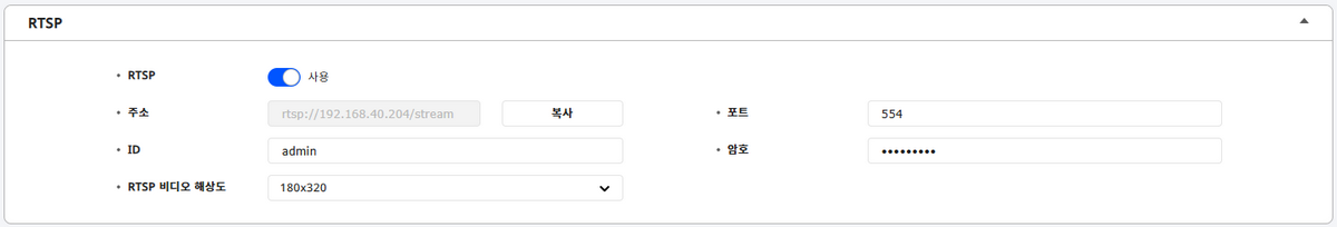 RTSP 비디오 해상도: RTSP 사용 시 출력되는 영상의 해상도를 선택하세요. 기본값은 180 x 320입니다.