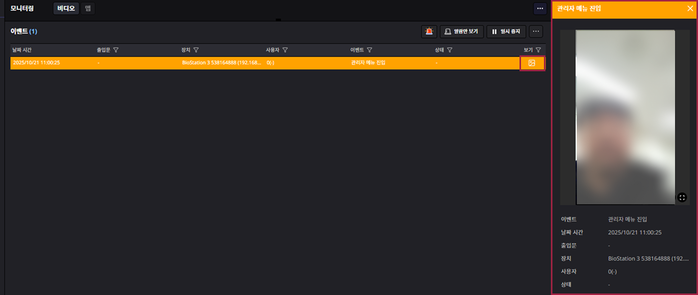 이미지 로그는 카메라가 있는 장치에서 발생한 이벤트를 이미지로 확인할 수 있는 기능입니다. 출입문을 통과하는 사용자의 얼굴 이미지나 이벤트 발생 시의 상황을 장치의 카메라로 기록할 수 있습니다. 기록된 이미지는 모니터링 페이지에서 실시간 이벤트를 통해 확인할 수 있습니다.