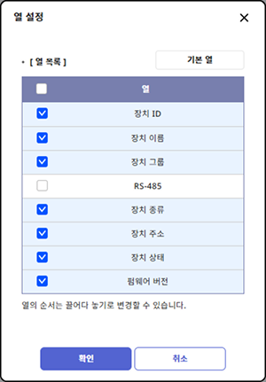 장치 목록에서 표시되는 열(Column) 설정을 변경할 수 있습니다. 열 설정을 통해 표시할 열을 선택하거나 열의 순서를 변경할 수 있습니다.