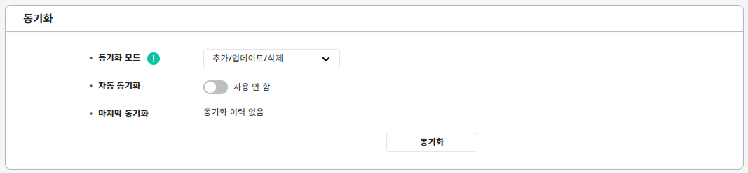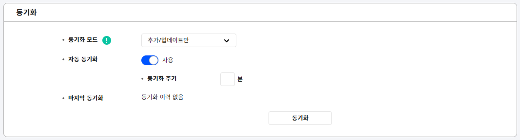 자동 동기화: 자동 동기화 간격을 설정할 수 있습니다. 동기화 주기에 설정한 간격에 따라 자동 동기화됩니다. 분 단위로 입력할 수 있습니다.