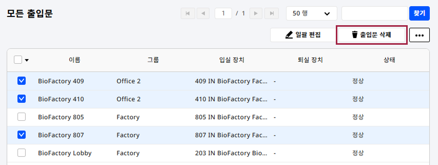 출입문 목록에서 삭제하려는 출입문의 체크박스를 클릭하세요.