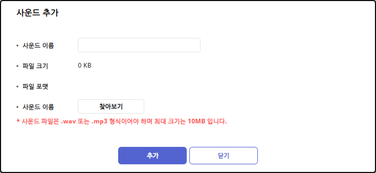 사운드 파일은 .wav 또는 .mp3 파일 형식만 업로드할 수 있습니다.