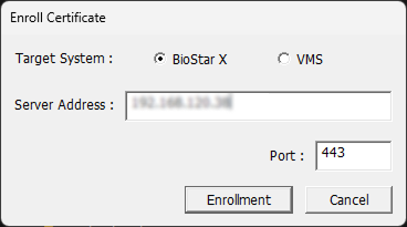 Target System을 BioStar X로 선택하고, BioStar X가 설치된 PC의 IP 주소를 Server Address에 입력한 뒤 Enrollment 버튼을 클릭하세요.