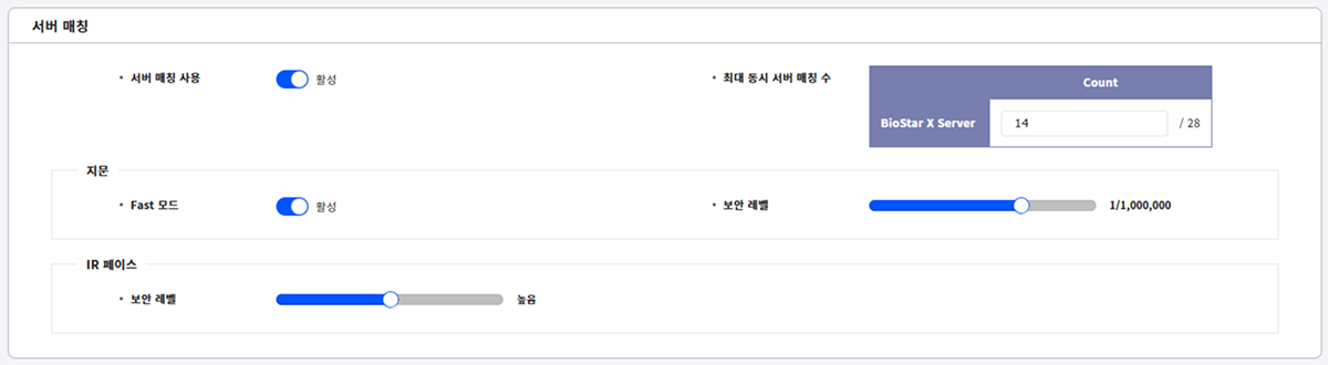 - 보안 레벨: IR 페이스에 대한 서버 매칭 보안 레벨을 설정할 수 있습니다. 보안 등급이 높을 수록 본인 거부율(FRR)이 증가합니다.