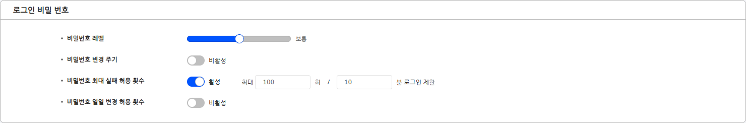 로그인 비밀 번호 섹션에서는 로그인 비밀번호와 관련된 보안 수준을 설정합니다. 조직의 보안 요구 사항에 맞춰 비밀번호 정책을 설정하세요.