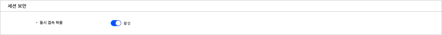 세션 보안 섹션에서는 보안 강화를 위해 동일 계정의 중복 로그인을 제한할 수 있습니다. 동시 접속 허용 옵션을 비활성으로 설정하세요. 동일한 계정에 대한 동시 접속 시도 시 기존에 접속해 있던 사용자는 로그아웃됩니다.