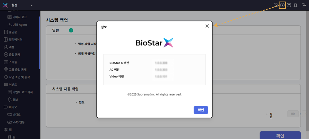백업 시점의 BioStar X 버전과 현재 버전이 다를 경우 복원을 진행할 수 없습니다. BioStar X의 버전을 확인하려면 화면 오른쪽 최상단의 버튼을 클릭하세요.
