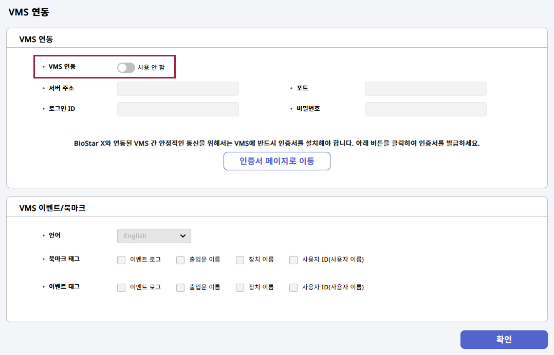 언어: VMS 서버에 전달하는 이벤트 및 북마크 태그의 언어를 선택하세요. 한국어 또는 영어를 선택할 수 있습니다.
