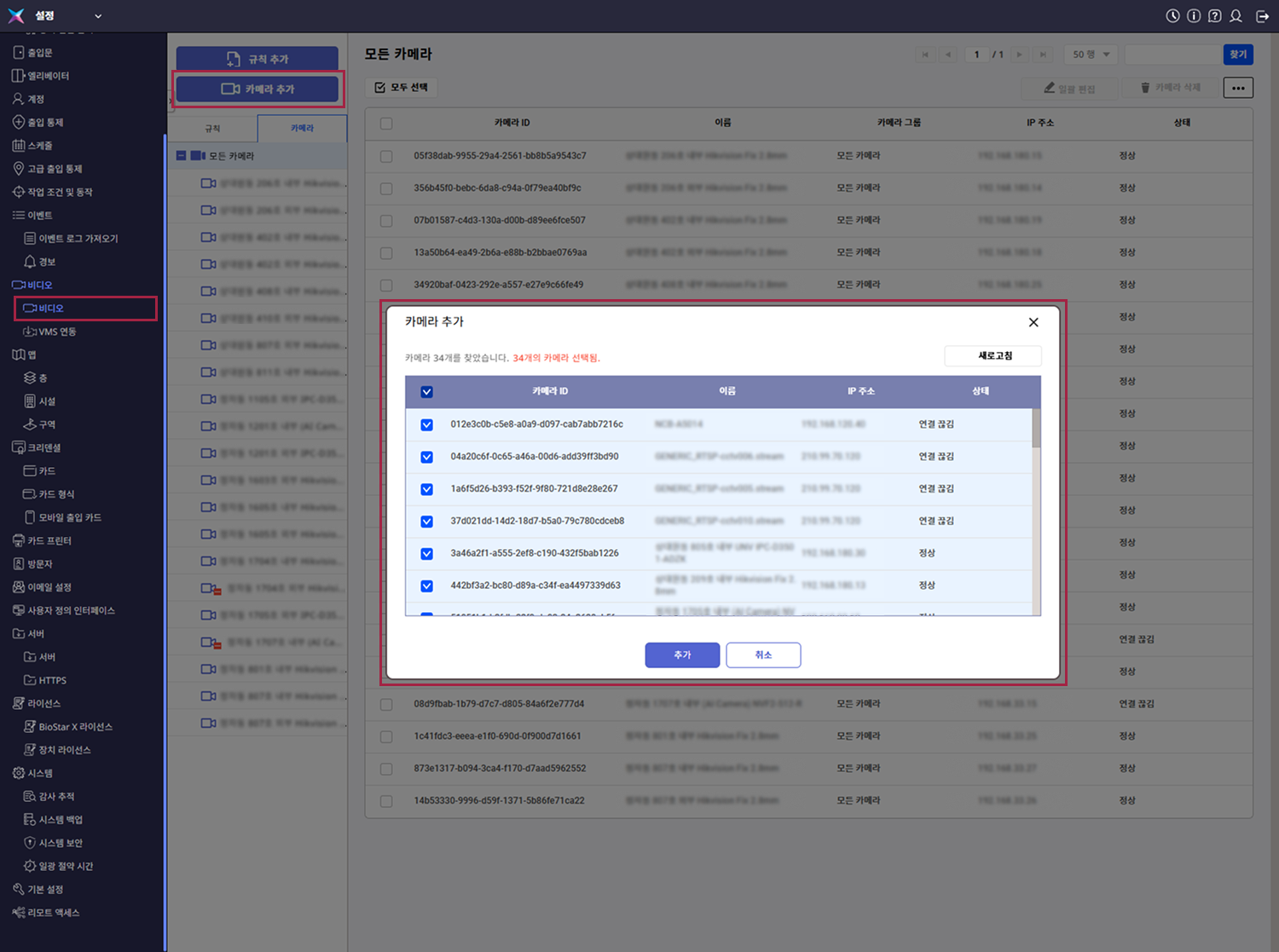 VMS 연동 후 설정 → 비디오 → 비디오 메뉴에서 카메라를 설정하고 관리할 수 있습니다.