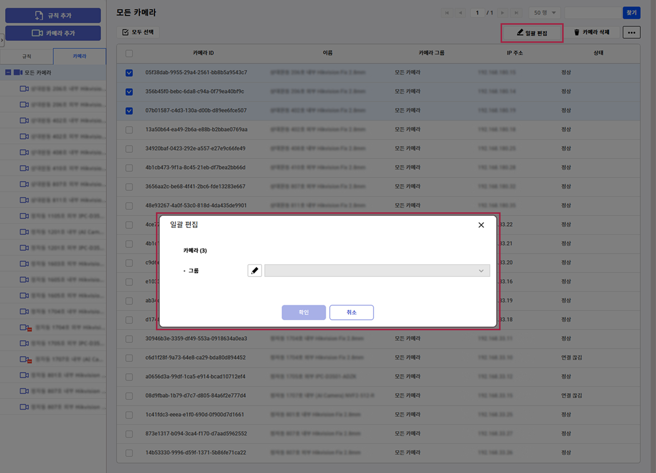 1대 이상의 카메라를 선택하면 화면 오른쪽 상단의 일괄 편집 버튼이 활성화됩니다. 일괄 편집 버튼을 클릭하세요.