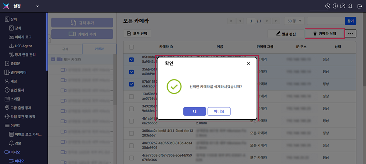카메라 목록에서 삭제할 카메라의 가장 왼쪽에 체크박스를 클릭하세요. 1대 이상의 카메라를 선택할 수 있습니다.