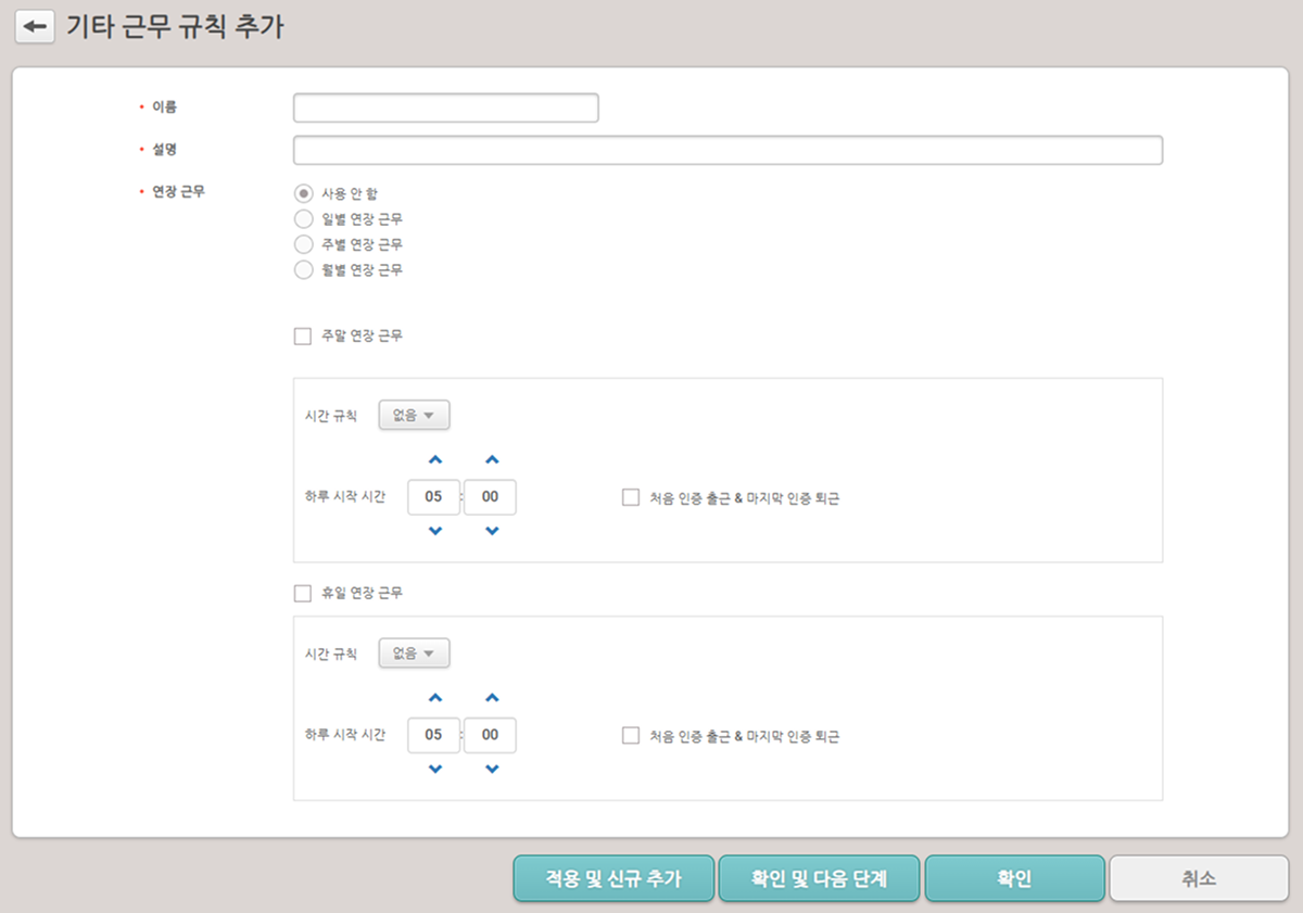 설정을 저장한 후 다른 기타 근무 규칙을 추가하려면 적용 및 신규 추가 버튼을 클릭하세요.