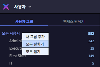사용자 그룹 목록을 확장하거나 축소할 수 있습니다. 사용자 그룹 탭에서 모든 사용자를 선택하고 마우스 오른쪽 버튼을 클릭하세요. 팝업 메뉴에서 모두 펼치기 또는 모두 접기를 클릭하세요.
