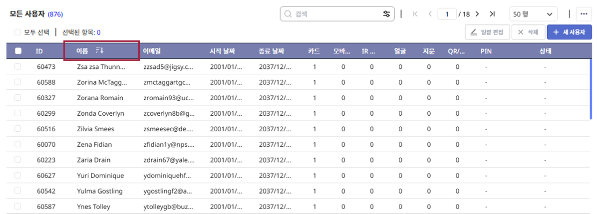 사용자 목록의 정렬 기준을 변경할 수 있습니다. 목록 상단의 열 제목을 클릭하면 오름차순 또는 내림차순으로 정렬할 수 있습니다. 예를 들어, 이름 열 제목을 클릭하면 사용자의 이름을 기준으로 오름차순 또는 내림차순으로 정렬됩니다. 이때 클릭한 항목에는 오름차순() 또는 내림차순() 아이콘이 표시됩니다.