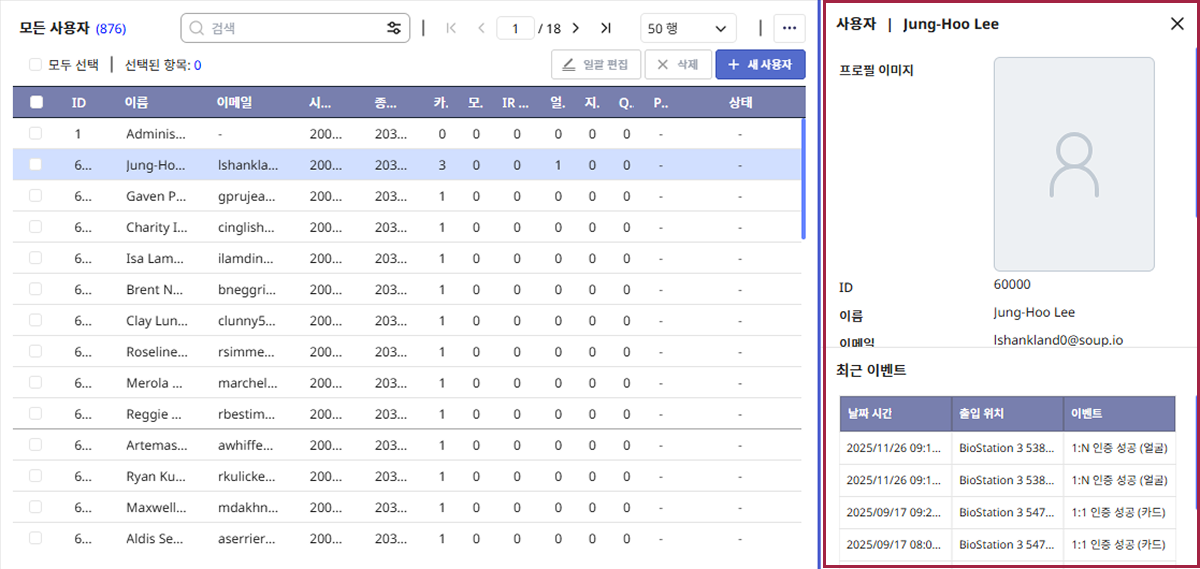 개별 사용자의 상세 정보를 확인하려면 사용자 목록에서 원하는 사용자를 클릭하세요. 사용자의 프로필 정보가 화면 오른쪽에 표시됩니다. 사용자 프로필 정보에서 자세히 보기 버튼을 클릭하면 사용자의 상세 정보를 수정할 수 있는 페이지로 이동합니다.