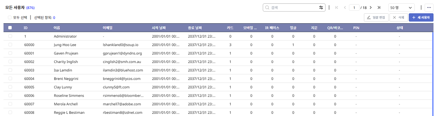 사용자 목록은 등록된 사용자를 모두 표시하며, 각 사용자의 아이디, 이름, 이메일 주소, 사용 기간, 등록한 크리덴셜 현황, 상태를 기본으로 확인할 수 있습니다. 사용자는 아이디 순으로 목록에 표시됩니다.