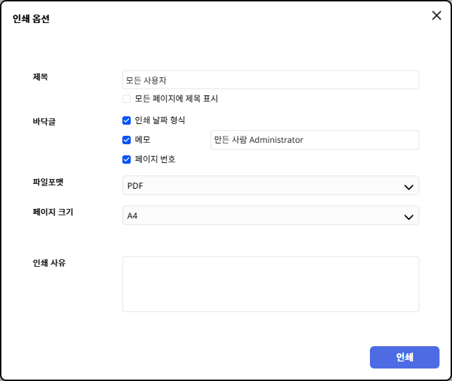 인쇄 사유는 필수 입력 항목이 아닙니다. 인쇄 사유는 설정 → 시스템 → 감사 추적에서 기록을 확인할 수 있습니다.