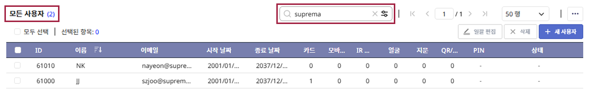 사용자의 아이디, 이름, 이메일을 기준으로 검색할 수 있습니다. 화면 상단의 검색 입력 필드에 원하는 키워드를 입력하고 Enter 키를 누르세요. 해당 키워드와 일치하는 사용자가 목록에 표시됩니다. 목록 최상단에서 검색 결과 개수를 확인할 수 있습니다.