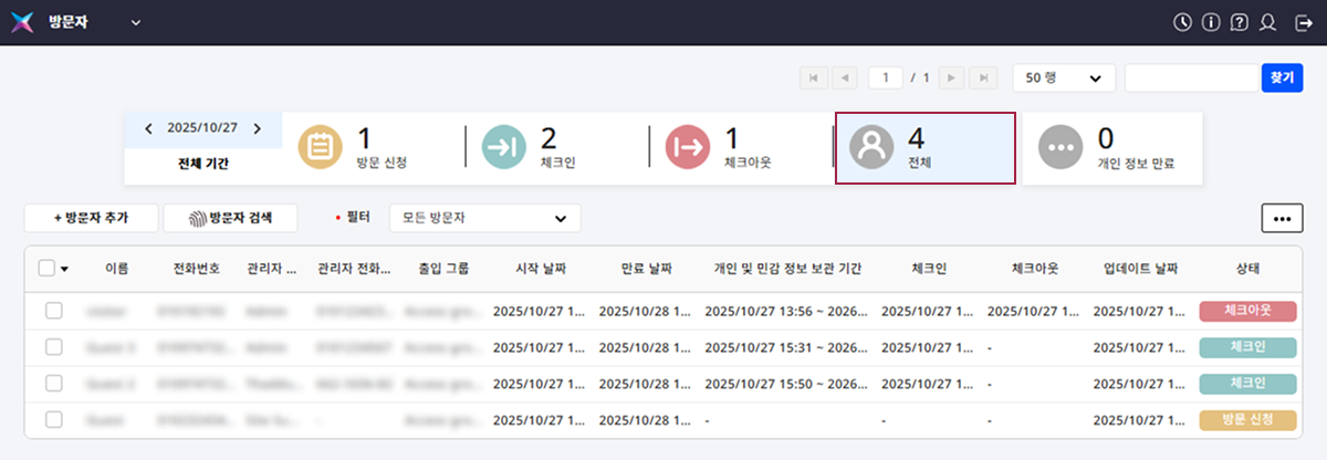 전체 방문자 목록에서 체크인 또는 체크아웃 상태의 방문자를 관리할 수 있습니다. 자세한 내용은 다음 문서를 참고하세요.