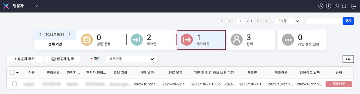체크아웃 상태의 방문자를 확인하고 해당 방문 신청 정보를 사용해 다시 방문을 등록할 수 있습니다.