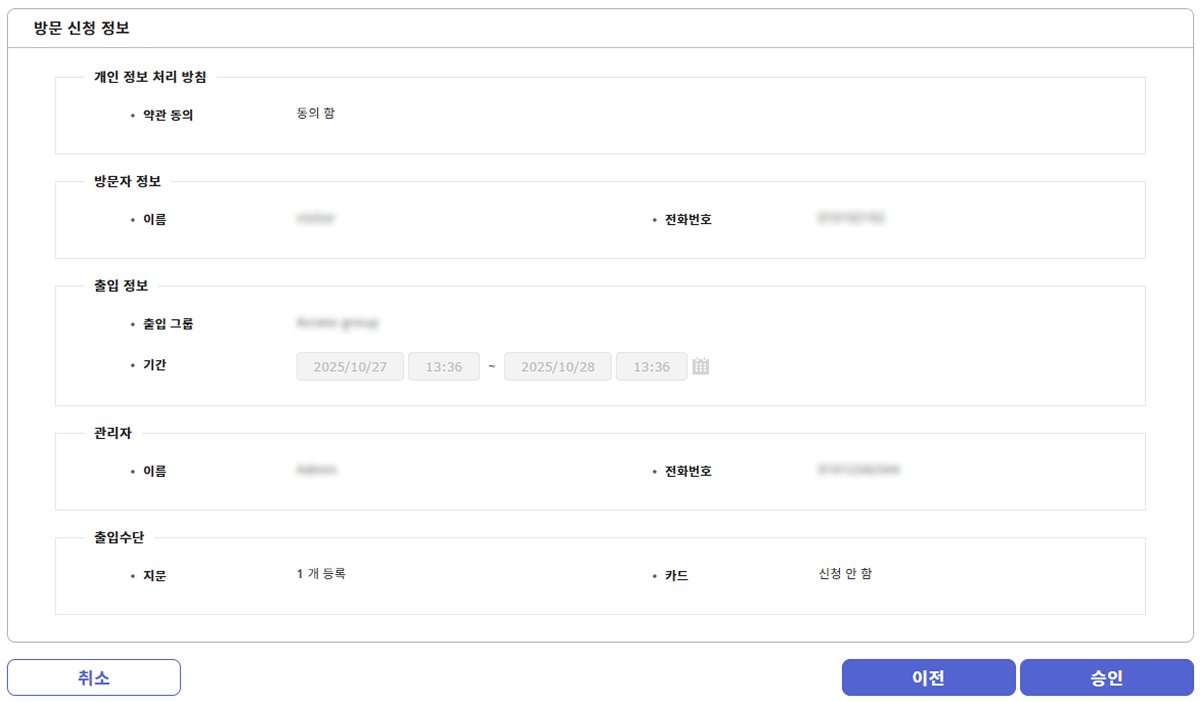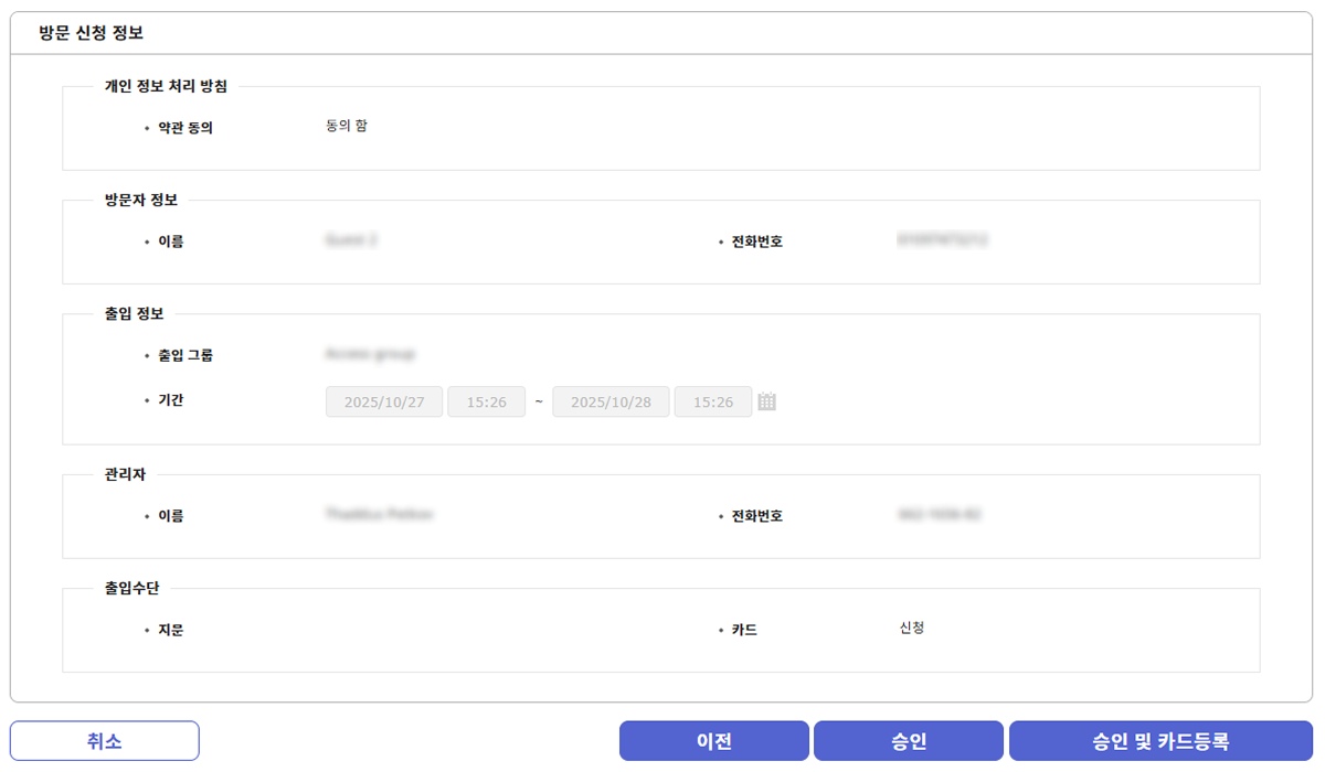 방문 신청 정보의 내용을 확인하고 방문을 승인하려면 화면 오른쪽 하단의 승인 버튼을 클릭하세요.