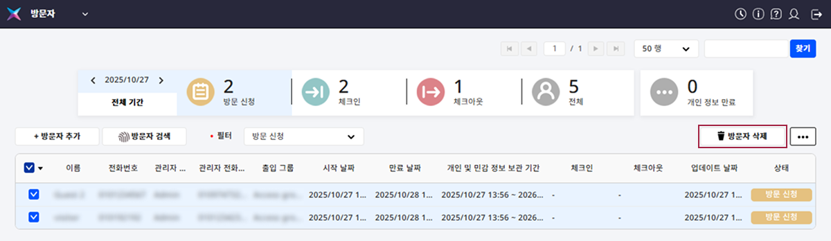 방문 신청 목록에서 삭제할 방문자의 체크박스를 클릭하세요.