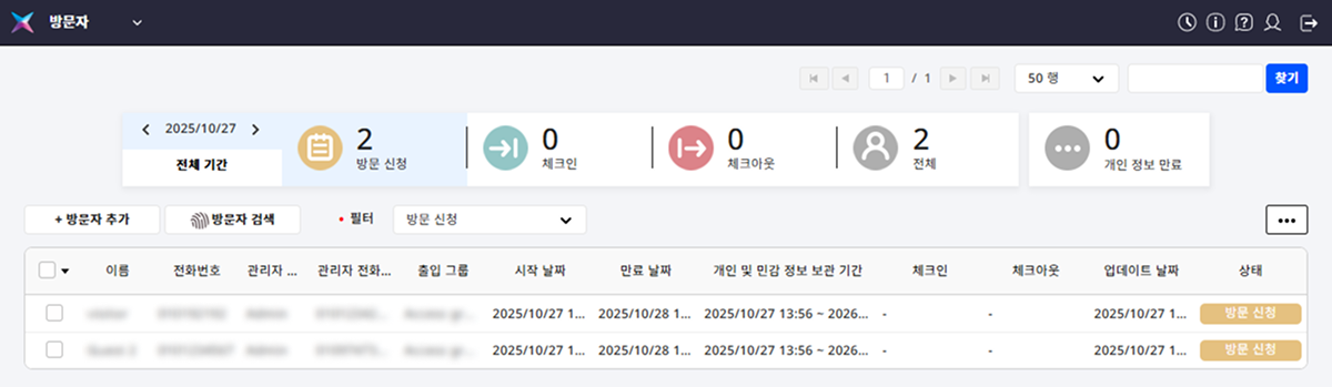 방문 신청을 승인하거나 수정할 수 있습니다. 관리자가 직접 방문자를 추가하거나 삭제할 수도 있습니다.